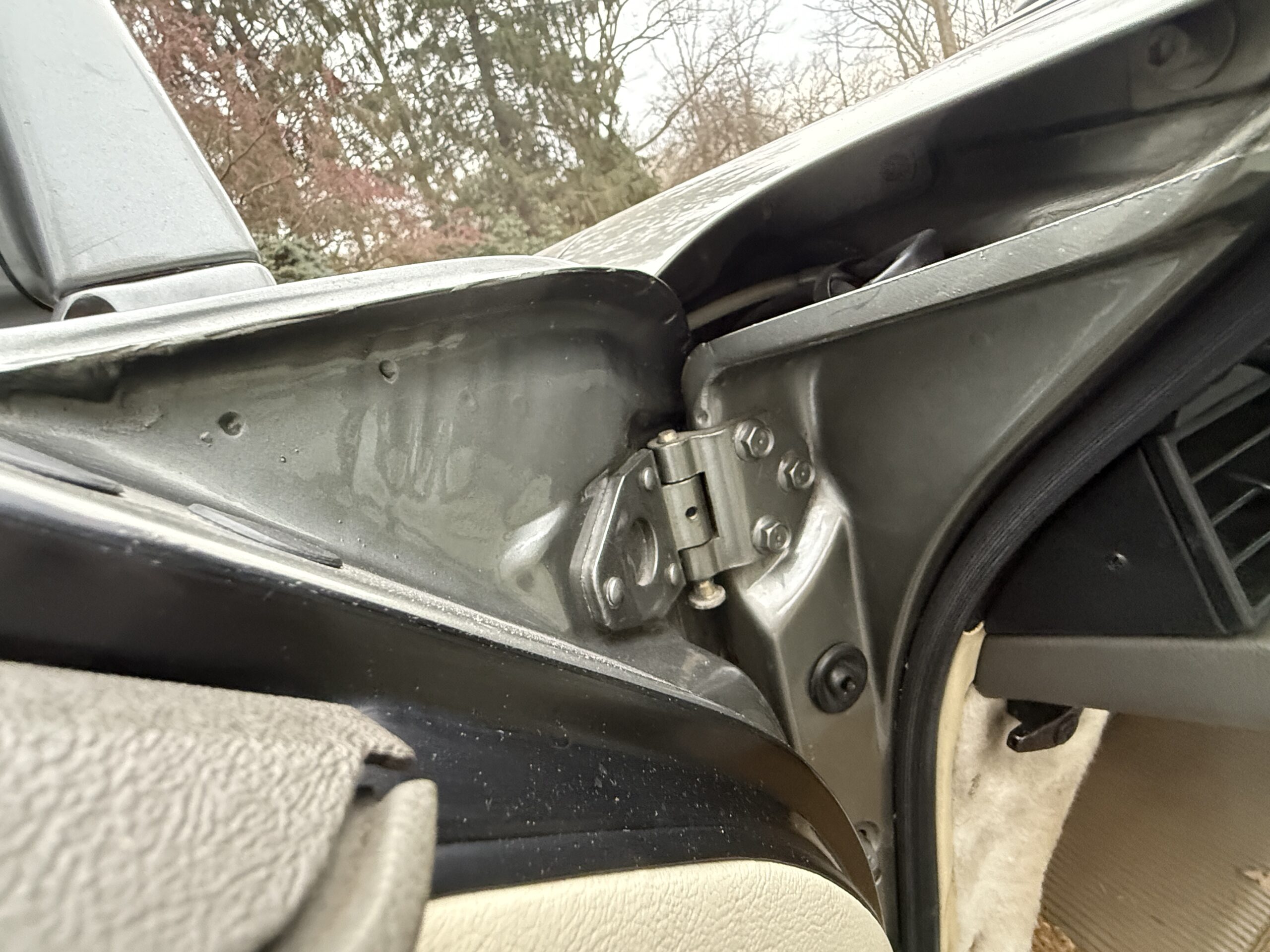 Felsen has traveled a bit over 102k miles. He has an upgraded Panasonic Bluetooth radio. The front seats are showing their age, the dash has two small sun cracks, beneath the tan coco mats are a matching set of original gray carpets.
